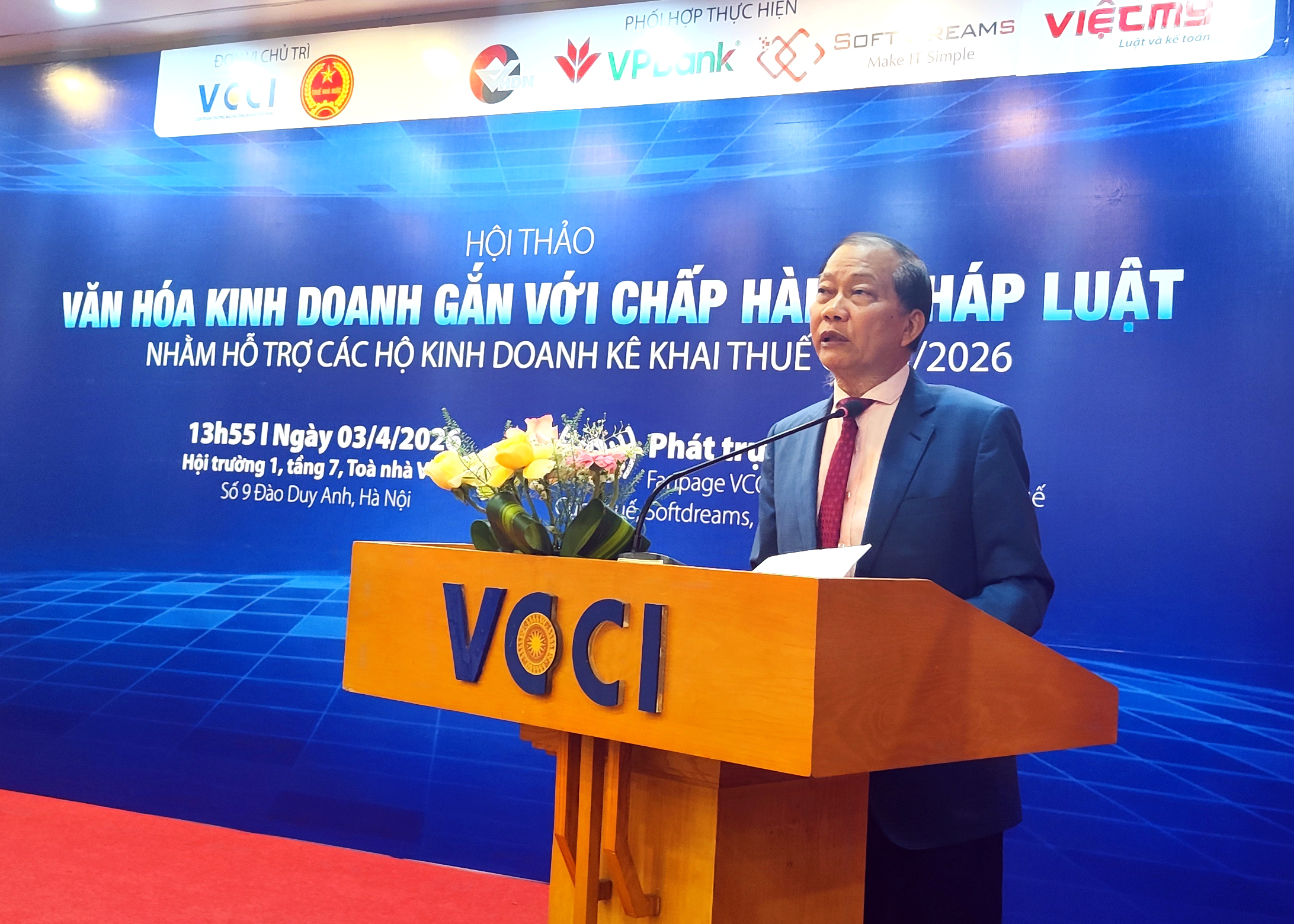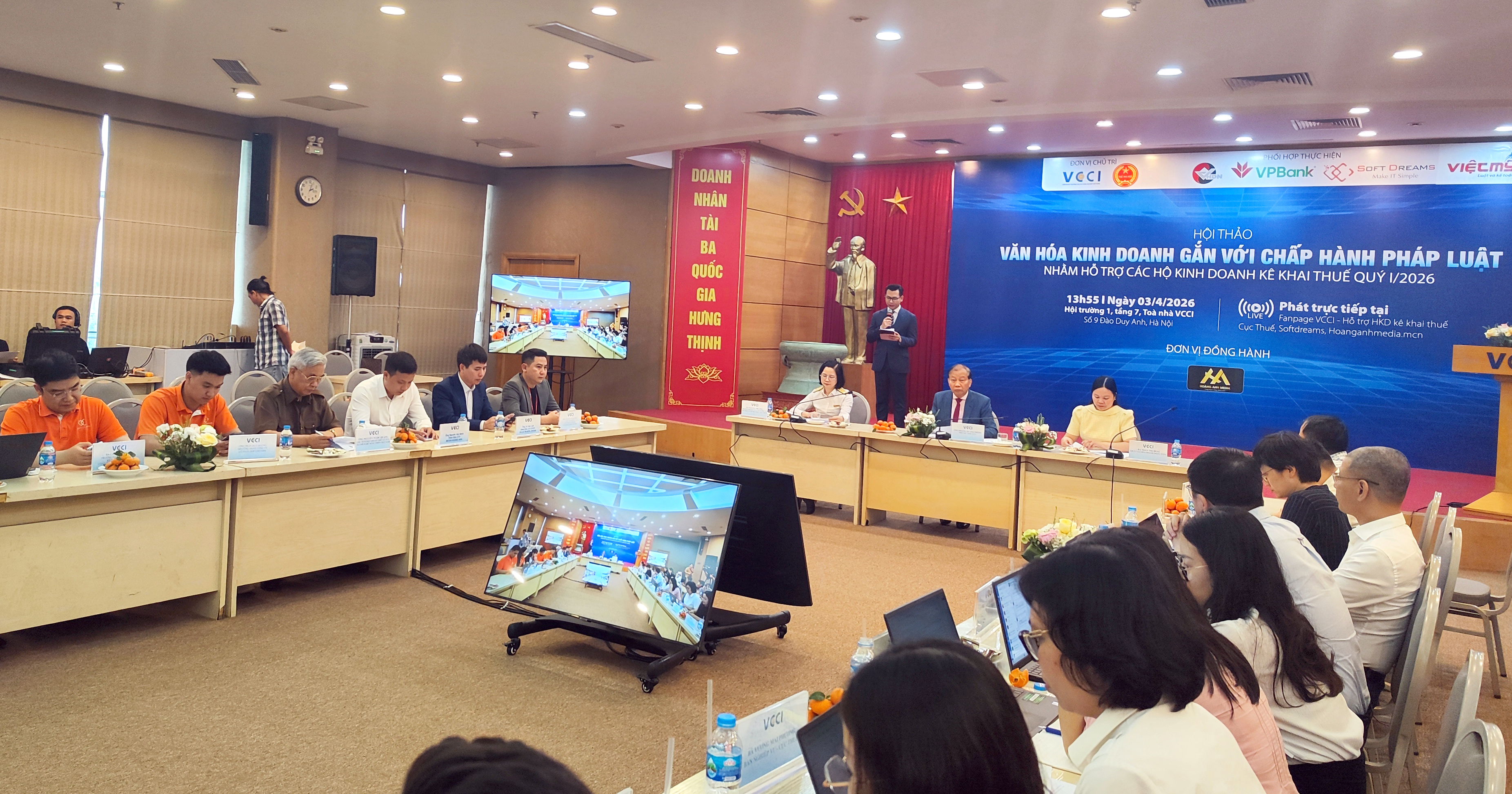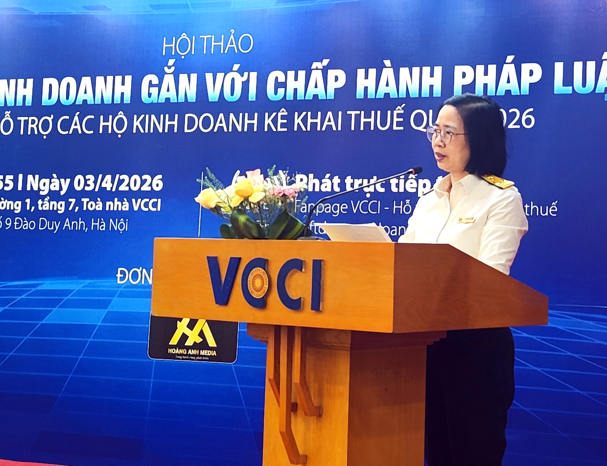 Chiều 3/4/2026, Liên đoàn Thương mại và Công nghiệp Việt Nam (VCCI) phối hợp Cục Thuế và các đơn vị liên quan tổ chức hội thảo “Văn hóa kinh doanh gắn với chấp hành pháp luật”, đồng thời triển khai hỗ trợ hộ kinh doanh thực hiện kê khai, nộp thuế quý I/2026. Tham dự Hội nghị có Ông Hoàng Quang Phòng, Phó Bí thư Đảng ủy, Phó Chủ tịch Liên đoàn Thương mại Và Công nghiệp Việt Nam, Bà Nguyễn Thu Trà - Trưởng Ban Quản lý tuân thủ và hỗ trợ người nộp thuế, Cục Thuế, Ông Nguyễn Ngọc Quang, Chủ tịch, Hiệp hội doanh nghiệp nhỏ và vừa ngành nghề nông thôn Việt Nam (VARISME) và đại diện ngân hàng cùng các chuyên gia, doanh nghiệp.